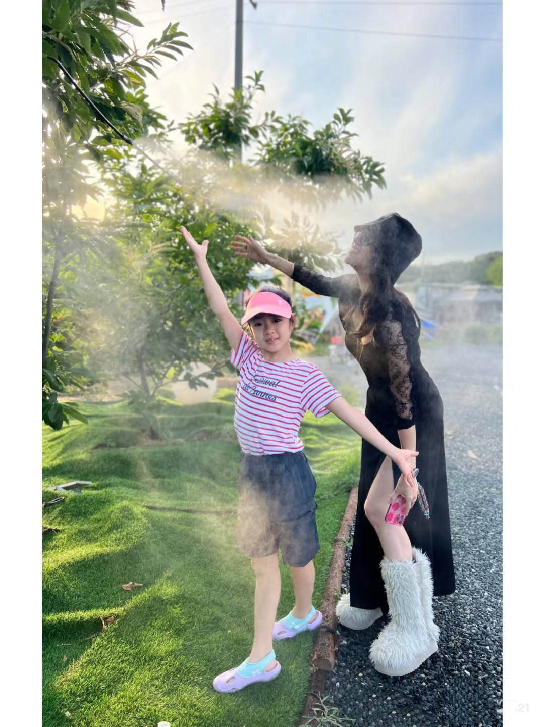这样的醒醒,看背影和妈妈真是太像了。两个人都很瘦、双腿也是又细又直的。尤其是章子怡叉腰等待买东西的模样,太接地气了。
