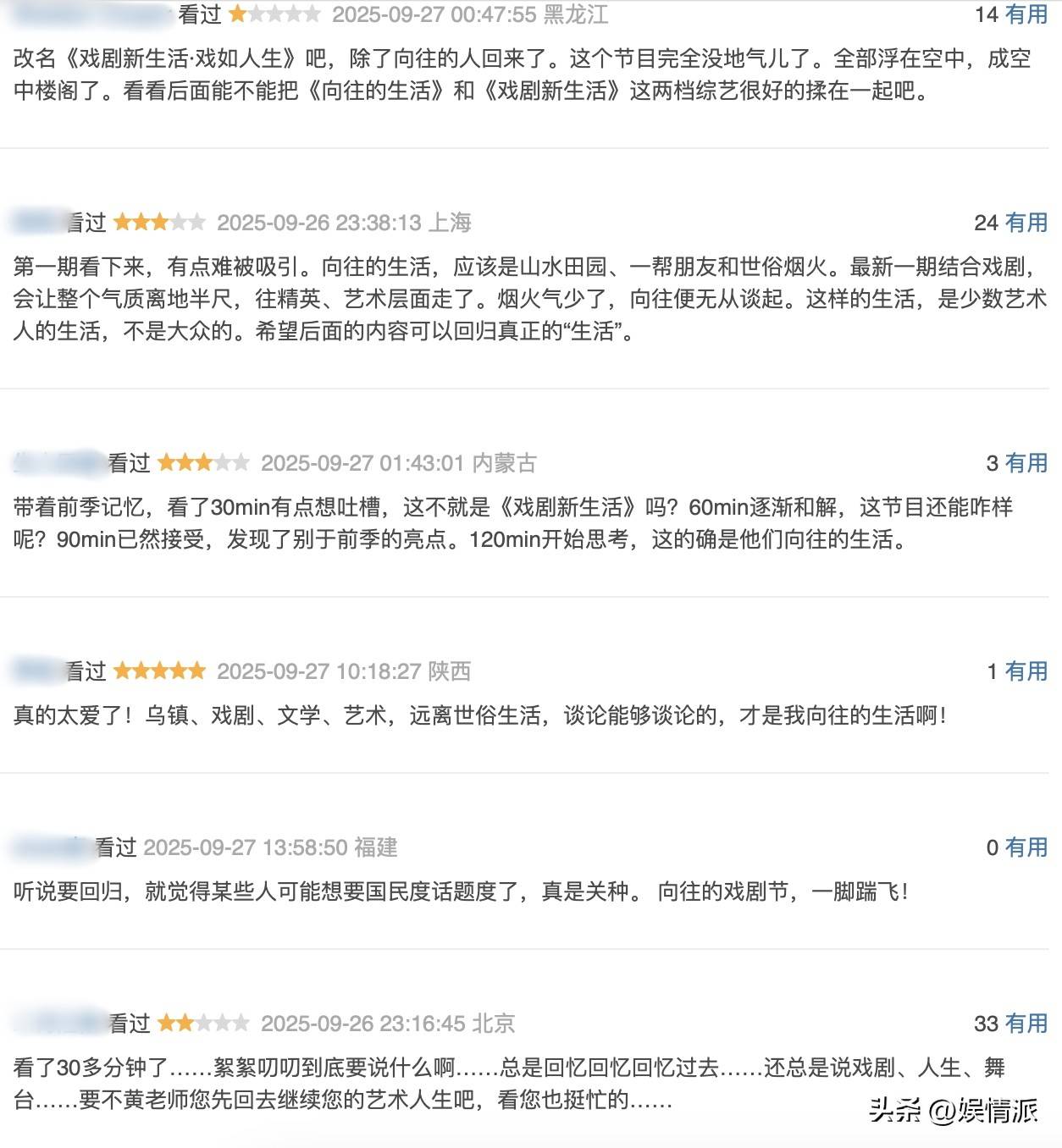也有的观众认为,嘉宾们干着自己的活儿,还没耽误挣综艺节目的钱,而且感觉他们的状态总有一种淡淡的伤感,每个人都没有很开心,与之前那几季刚开播时的状态相比,简直是完全两种状态,加上这一季主题一变,现在“向往的生活”变成了少数艺术人的生活,并不是普通大众的。