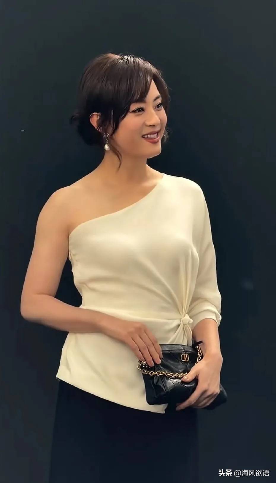 这次的造型选得太绝了,一身单肩白衫配曳地黑裙,腰间的扭结设计刚好凸显身材曲线,简约又高级。