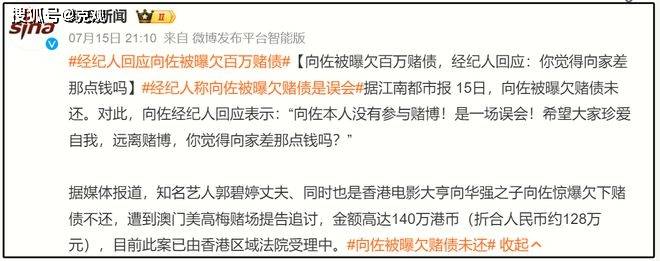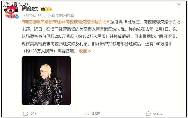 今年7月份,向佐被曝欠债百万未还,被美高梅告上法庭,要求其还清剩下的140万港币。之后向佐经纪人表示向佐并没有参与赌博,只是一场误会,还反问大众:你觉得向家差那点钱吗?
