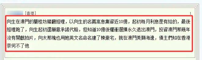 只不过知情人士,向家遇人不淑,赌场的经理以向华强的名义高息集资10亿后跑路,向家也只能宣布永远退出澳门市场。