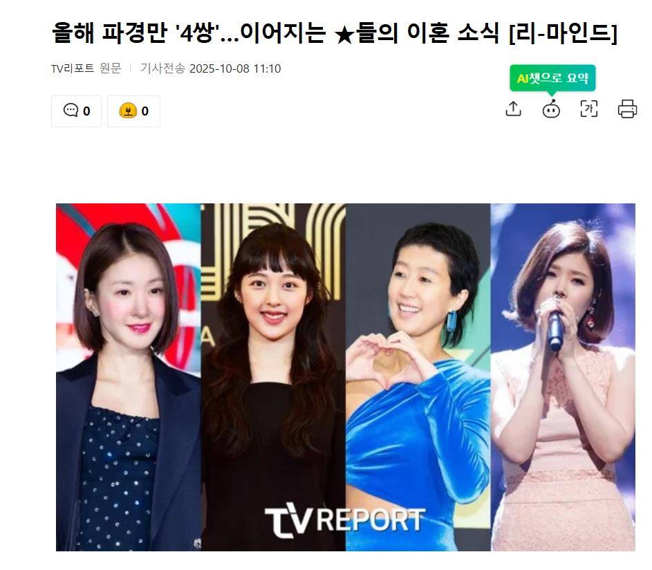 2025年才过十个月,韩国娱乐圈的“离婚潮”却已悄然袭来,接连四对明星夫妇分道扬镳的消息,一次次冲击着大众的认知。10月8日,有韩国媒体盘点了2025年离婚的四位韩女星,从八年夫妻到十一个月短婚,从低调协议到冷冻胚胎引发的伦理争议,每一桩都堪称“韩娱年度大戏”。