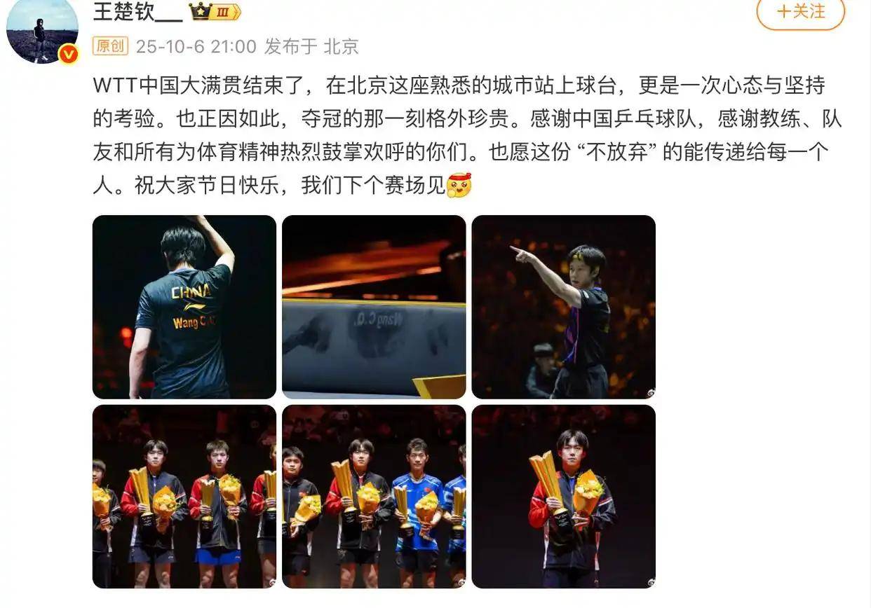 10月6日,王楚钦在社交媒体上发文总结了自己在2025年WTT中国大满贯的表现。他写道:“WTT中国大满贯结束了,在北京这座熟悉的城市站上球台,更是一次心态与坚持的考验。也正