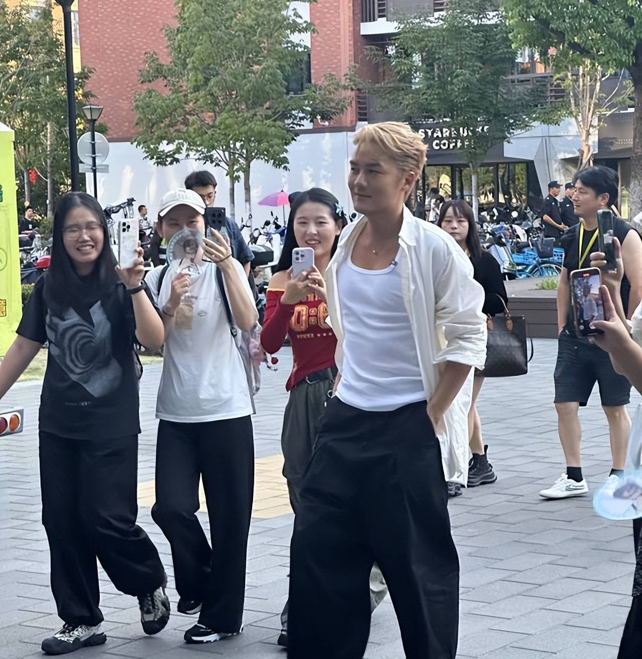 吴克群的到来显然不是秘密。随着他和团队工作人员进入校园,食堂周围瞬间聚集了大量学生。有人远远看到他便举起手机,有人悄悄推开身边的同学,想更靠近一点。短短几分钟内,校园里弥漫着一股“偶像效应”,吴克群成了学生们谈论的焦点。
