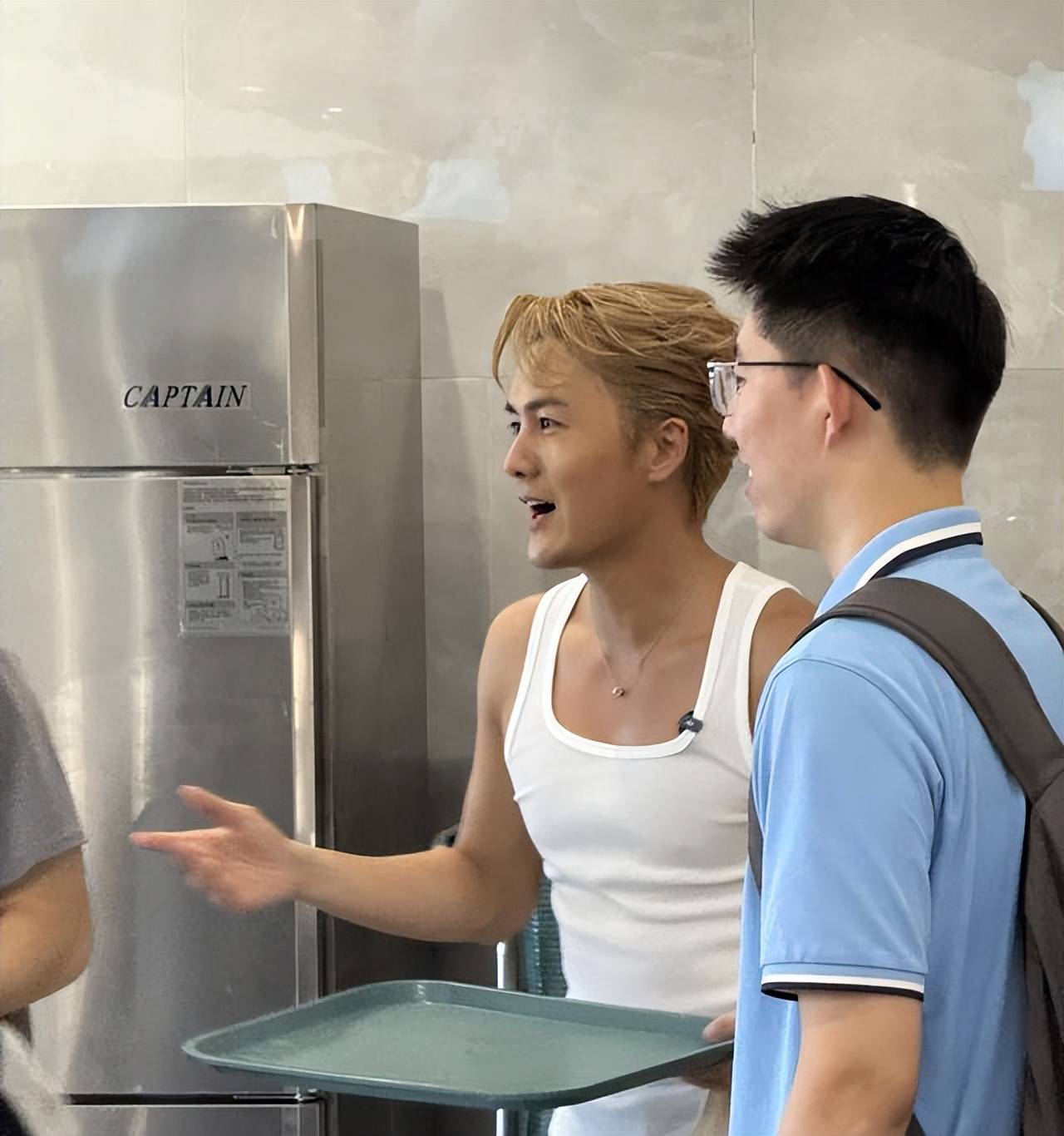 吴克群的用餐过程简单而真实。他没有安排特别的服务人员为他端菜,而是亲自去取餐盆,挑选自己喜欢的菜品。没有刻意炫耀,也没有高调张扬,甚至在他身边的学生拍摄时,他只是友好地笑了笑,轻轻点头回应。这样平凡却真诚的举动,让现场学生感受到了一种亲切感——他们心中的偶像,不再只是舞台上光芒万丈的明星,而是一个真实、温暖、可以走进生活的人。