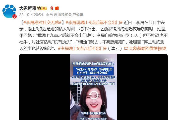 当祝绪丹发出夜场吃烧肉的邀约,李晟说:不去。近日李晟在节目中的回应不去的原因:我晚上九点之后就不会出门啦。”这并非一句简单的推辞,而是她为自己生活划下的一道明确边界。近日,演员李晟在节目中的这番坦言,让#李晟晚上9点后绝不出门#的话题悄然出圈,在推崇高效社交与碎片化娱乐的时代,掀起了一场关于个人空间与自我掌控的讨论。
