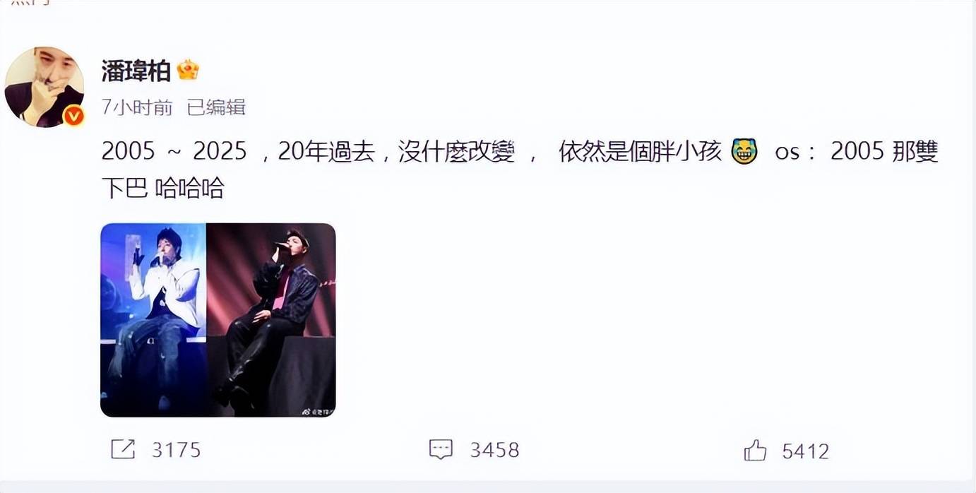 这竟然是潘玮柏”的背后,是一场跨越二十年的形象反差与粉丝的温情互动。9月4日,歌手潘玮柏在社交平台发布一条意味深长的动态:“2005 ~ 2025 ,20年過去,沒什麼改變 ,依