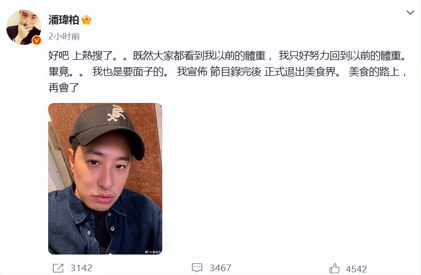 这场由本人亲自发起的“回忆杀”,迅速将#这竟然是潘玮柏#推上热搜榜。面对热议,潘玮柏随即再度发文回应,语气中带着几分无奈的幽默:“好吧 上熱搜了。。既然大家都看到我以前的體重, 我只好努力回到以前的體重。畢竟。。 我也是要面子的。”为表决心,他更是郑重宣布:“我宣佈 節目錄完後 正式退出美食界。美食的路上, 再會了。”
