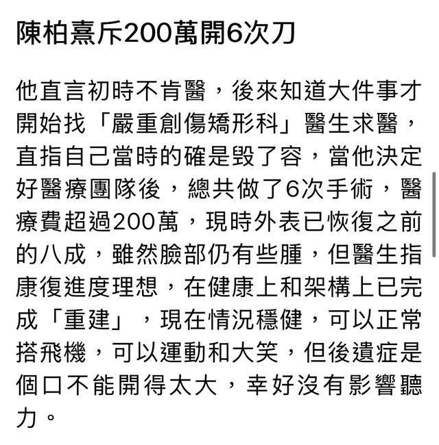 在检查后证实面部受创了,陈柏熹还曾经一度去工作,当时还出席了一个时尚活动,他称当时已经答应了这个工作,就硬着头皮顶上。结果被其母亲知道之后,勒令他去看医生,所以他就这么消失了两年。陈柏熹称治疗的过程远比想象中困难很多,因为牵涉到鼻子,颧骨还有耳朵。为了治疗,他半年内找了至少十个医生,遍及内地、台湾、香港,乃至韩国、新加坡都找了,前前后后,花了至少用了两年的时间,花了200万治疗,才一步一步康复过来,得以重新开始生活。