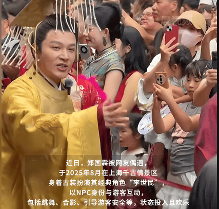 郑国霖甚至放飞自我,他穿上古装与人共舞,主动招揽顾客,非常尊重这份工作,这位明星放得下架子,玩得开,活跃了气氛,让在场的游客觉得钱没有白花。