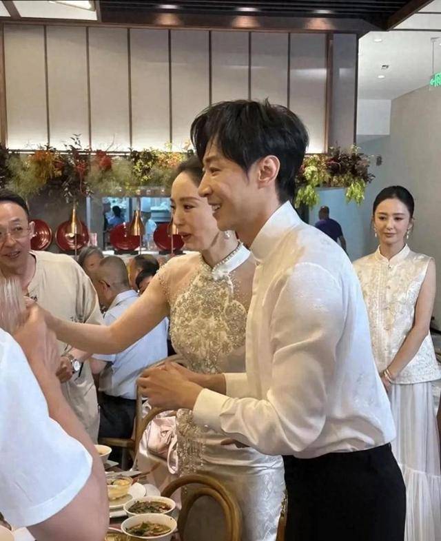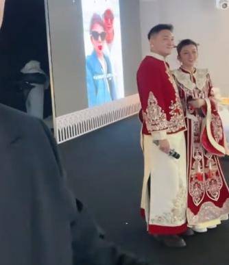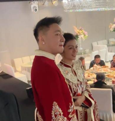 从曝光画面看,谈莉娜和新郎穿着中式龙凤褂,真可谓是郎才女貌。