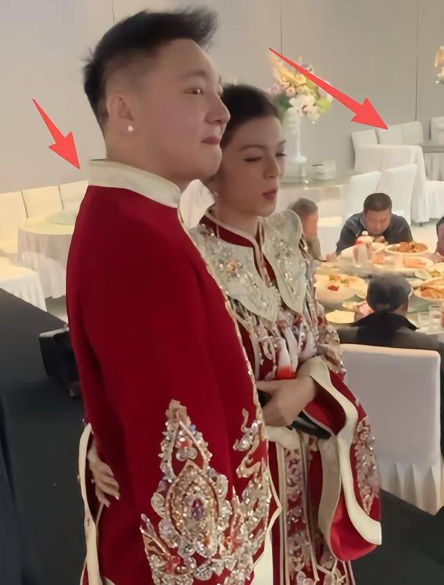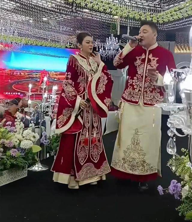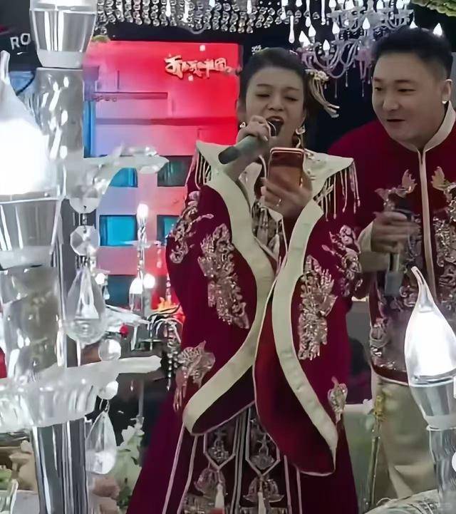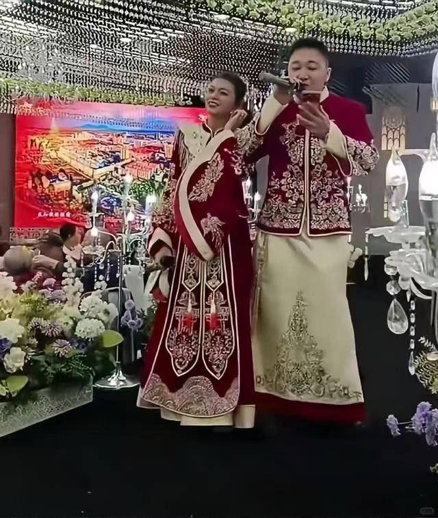 小两口在舞台上激情献唱,台下的宾客依旧在埋头干饭,这冷清的场面不像是婚礼现场,倒更像是谈莉娜来商演的。