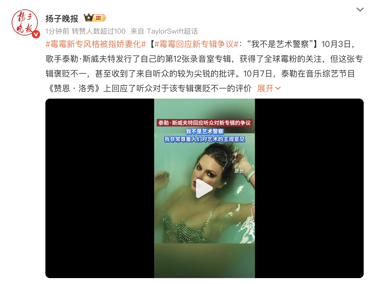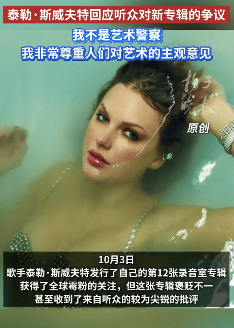 (来源:扬子晚报)10月3日,歌手泰勒·斯威夫特发行了自己的第12张录音室专辑,获得了全球霉粉的关注,但这张专辑褒贬不一,甚至收到了来自听众的较为尖锐的批评。10月7日,泰勒在