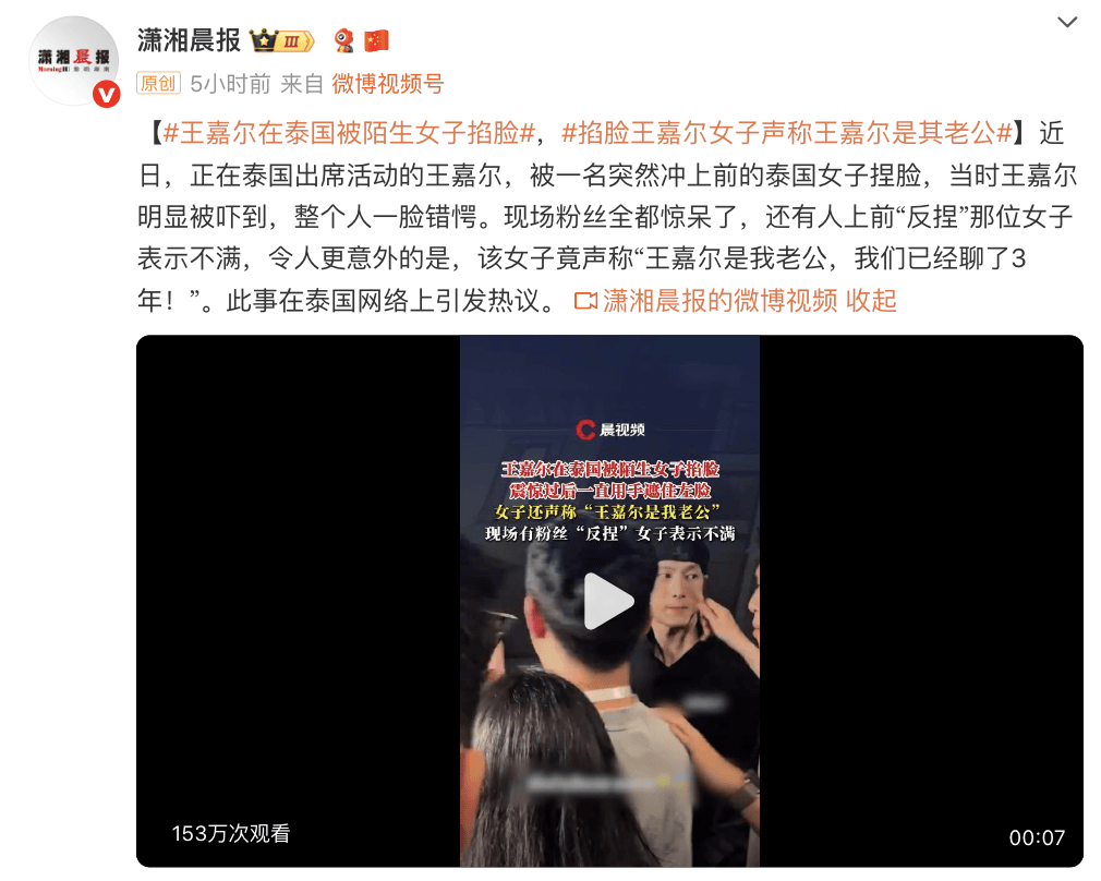(来源:潇湘晨报)近日,正在泰国出席活动的王嘉尔,被一名突然冲上前的泰国女子捏脸,当时王嘉尔明显被吓到,整个人一脸错愕。现场粉丝全都惊呆了,还有人上前“反捏”那位女
