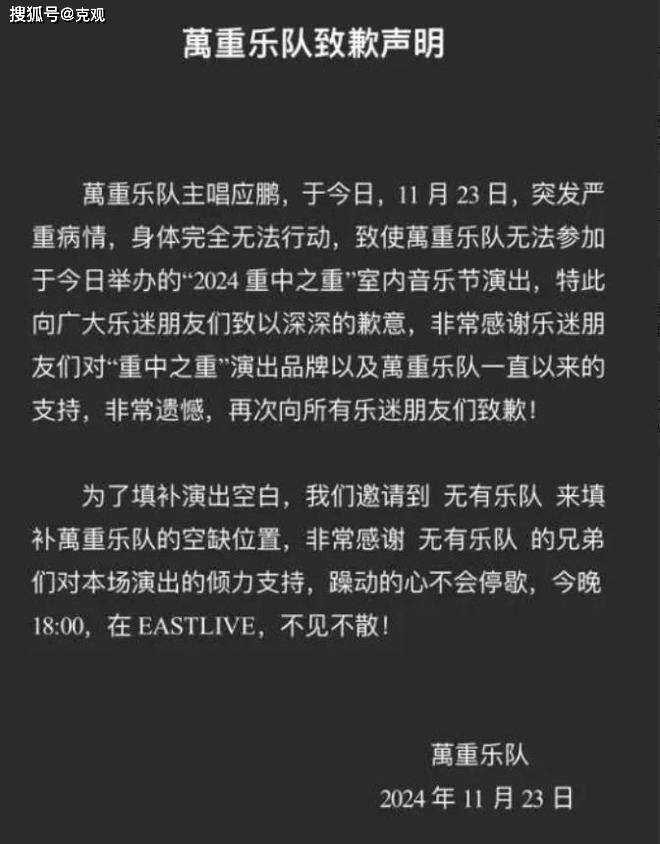 或许是因为应鹏的长期酗酒,乐队实在忍受不了才会在去年11月27日发出了一纸声明,宣布与应鹏终止合作。