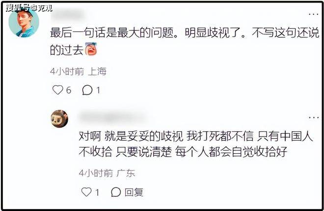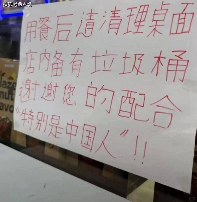 很多网友也表示最后一句话是最大的问题,明显是在歧视中国顾客。网友不相信不可能只有中国人不收拾,绝对是店家带着有色眼镜,故意歧视中国人。