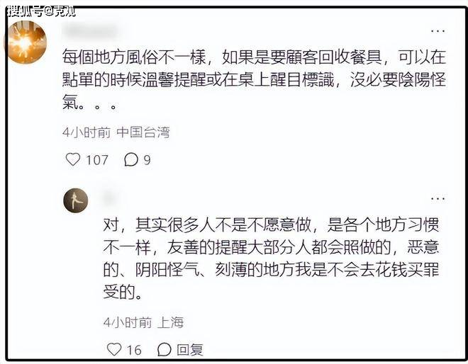 当然也有人认为每个地方的风俗不一样,比如香港日本新加坡这些地方,确实是需要顾客清理桌面。只不过网友认为如果真的需要顾客回收餐具,完全可以在点单的时候温馨提示一下,或者在桌子上醒目的标识出来,完全没必要阴阳怪气。要知道很多国人并不是不愿意这么做,只是当地习惯不一样。只要友善的提醒,大部分人还是会照做的,但是这样阴阳怪气、言语刻薄,相信大部分都不会去花钱买罪受。