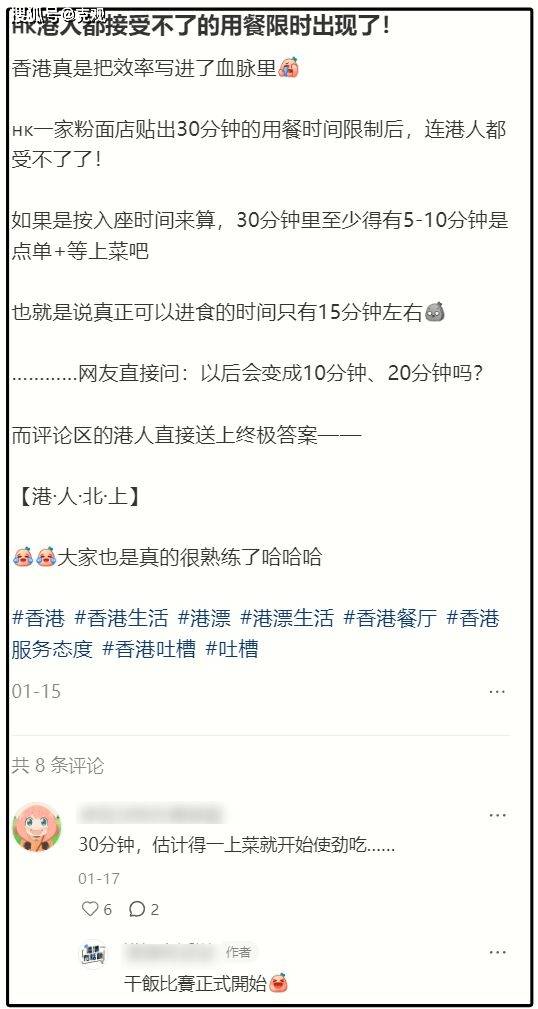有网友称这是香港人都接受不了的用餐限时,这家粉面店居然贴出了这样的用餐限制。网友算了一下时间,从入座时间来算的,30分钟里起码有5-10分钟是点单+等上菜,也就是说真正的进食时间只有15分钟左右。按照这个速度,估计一上菜就得使劲吃了。