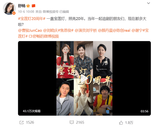10月6日,舒畅在自己的社交账号发出一条消息,表示:一盏宝莲灯,照亮20年。当年一起追剧的朋友们,现在都多大啦?随后,舒畅还提到剧中的多位演员,并配上“宝莲灯20周年”话题。