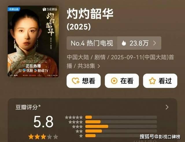 《灼灼韶华》收视率一路起飞,突破4的边界,不仅超越杨幂《生万物》,成了央视八套的年度冠军,更将《狂飙》甩在身后,登上史冠宝座。与这辉煌战绩形成残酷对比的,是其豆瓣仅5.8分的