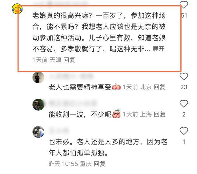 不过人活到这个年纪,需要的并不是金钱和美食,而是精神状态带来的支撑,有儿子的这份孝心,她定能寿比长山不老松。