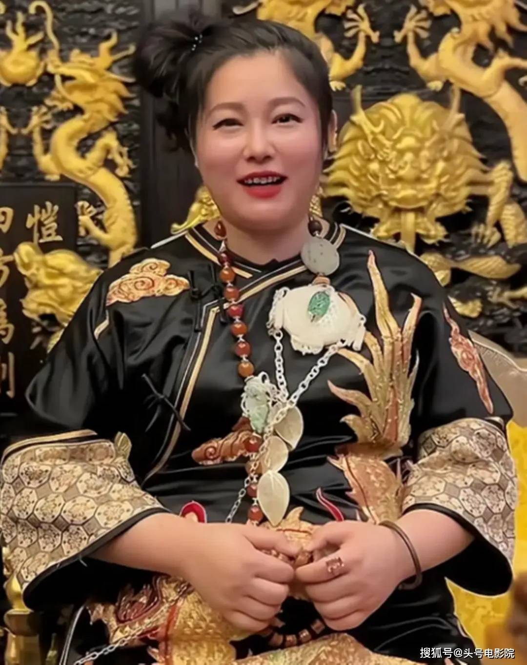 之后,8月初,于娜干脆勇敢自曝了自己变胖的原因,当时她穿着一件黑底金色刺绣中式褂子,脖子上还挂了一长串首饰,珠光宝气,贵气十足。