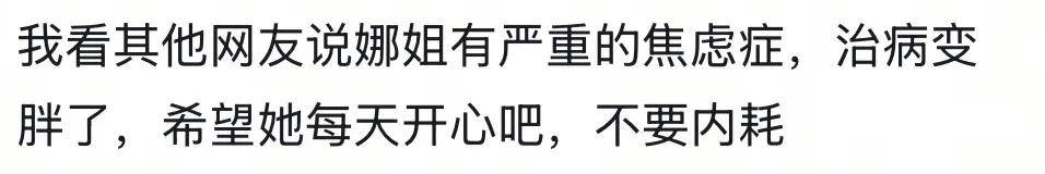她解释自己发胖是因为从抑郁转焦虑,因为吃药的副作用以及湿寒重导致发胖。