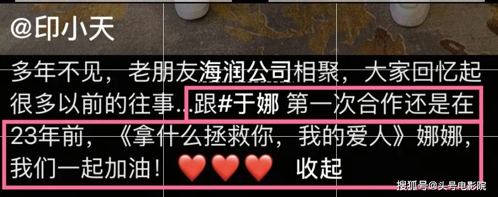 他写道:“多年不见,老朋友海润公司相聚,大家回忆起很多以前的往事……跟于娜第一次合作还是在23年前,《拿什么拯救你,我的爱人》。娜娜,我们一起加油!”