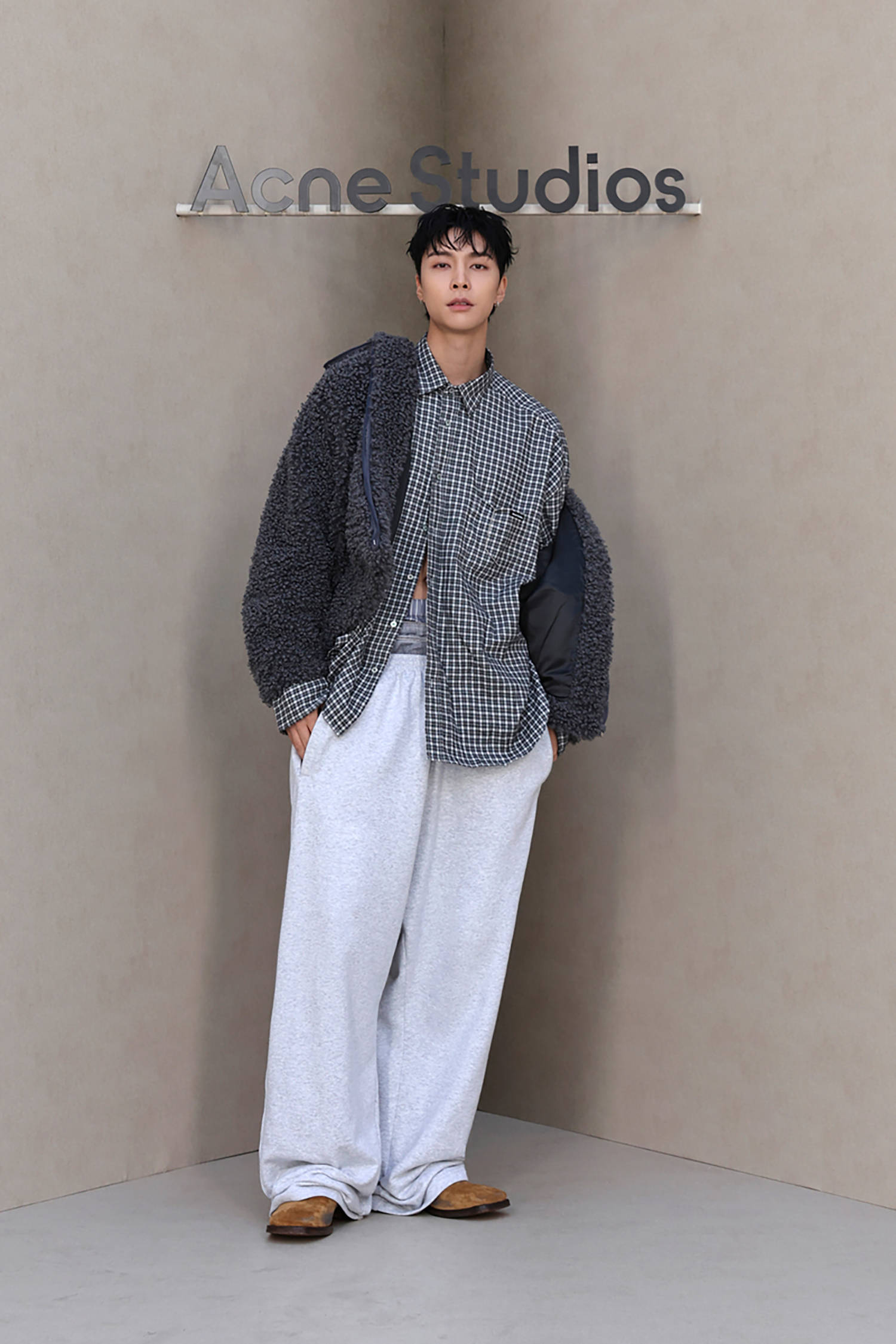 JOHNNY于10月1日(当地时间)出席在法国巴黎举行的Acne Studios系列大秀,身穿灰色毛绒感廓形外套搭配格纹衬衫、宽松白色长裤与棕色乐福鞋,完美展现品牌自由奔放的感性,营造出强烈的化学反应。