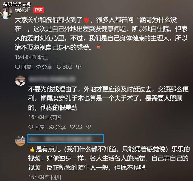 家庭的原因?让大家很自然就质疑起杨乐乐和汪涵的婚姻情况了。要知道一个人动手术堪称“十级孤独”,看着杨乐乐如此虚弱的躺在病床上,就连粉丝看着都十分心疼,更何况是家人呢?因此有不少网友在评论区质问杨乐乐“老公呢”,还怀疑两人早就离婚了。