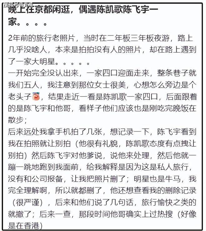 该网友拿着手机拍了几张照片,被陈凯歌一行人看到于是制止。网友强调陈凯歌态度有些拽,让网友不要拍;陈飞宇虽然也制止拍照,但很有礼貌。他对陈凯歌说自己来处理,然后一蹦一跳的跑到该网友面前。细细解释说这是私人旅行,没有和公司报备,让网友删除了。之后还很严谨的想要查看该网友的删除记录。