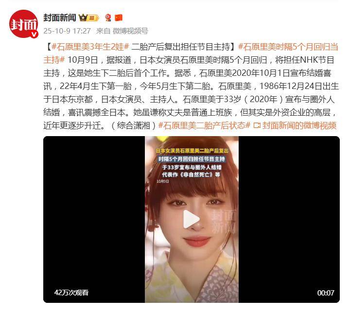 时隔5个月,38岁的日本国民女神石原里美再度回归公众视野——这一次,她以NHK节目主持人的身份宣告产后复出。短短三年内完成结婚、连育两子、两次高效复出的节奏,让网友直呼:“这姐把人生过成了倍速模式!”