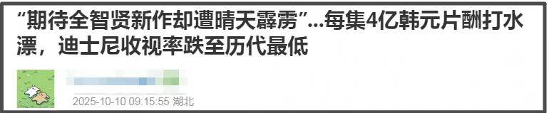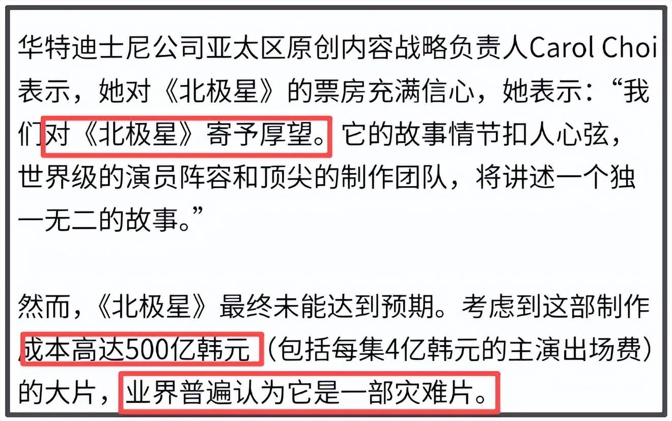 据悉,迪士尼内容战略负责人对《暴风圈》的票房寄予厚望,对全智贤充满信心,但播出效果不达预期,配不上高达2.5亿的制作费,业内直接把它定性为灾难片,足见有多差。而且,该剧主演200万一集的片酬也让人讶异,不知是单人还是所有主演,若是单人主演,迪士尼就是冤大头。