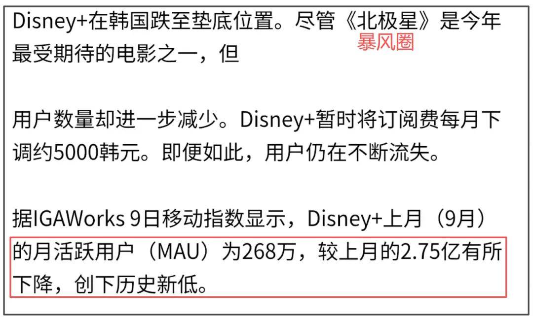 《暴风圈》史诗级的扑街说明迪士尼的自救无效,本来迪士尼期望靠全智贤的影响力活跃用户,带动拉新,阻止平台订阅用户及观看用户流失。但事实是毫无办法,即便迪士尼为了挽回客户自动把订阅费用减至一半,但活跃用户还是只有268万,相比8月份减少了7万,跌到了历史最低值。