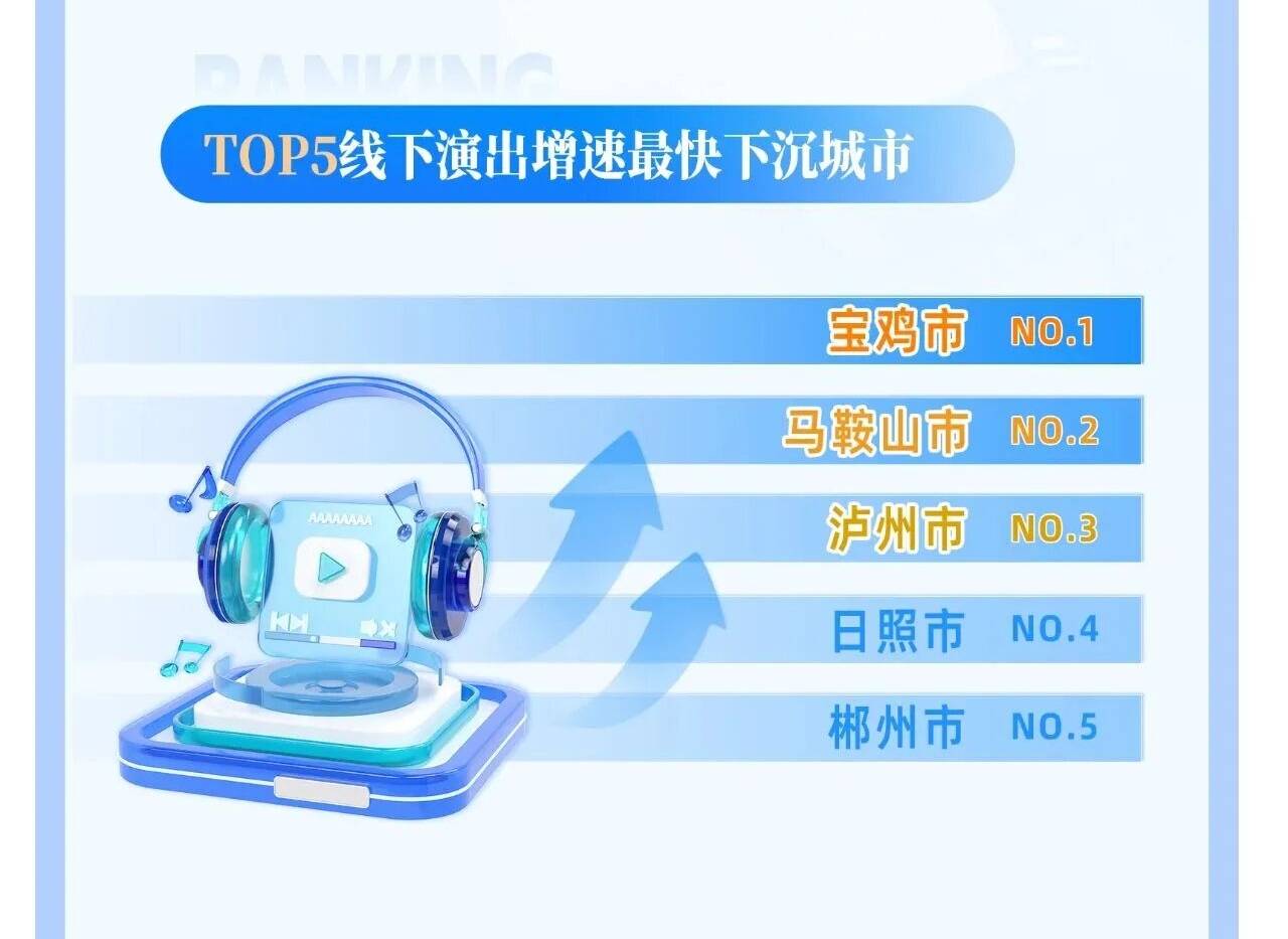 《报告》显示假期期间三四五线城市的演出活动显著增加,演出总场次同比增长34.1%,总票房也大幅上升86.6%,线下演出增速最快的下沉城市TOP3分别为宝鸡、马鞍山和泸州。
