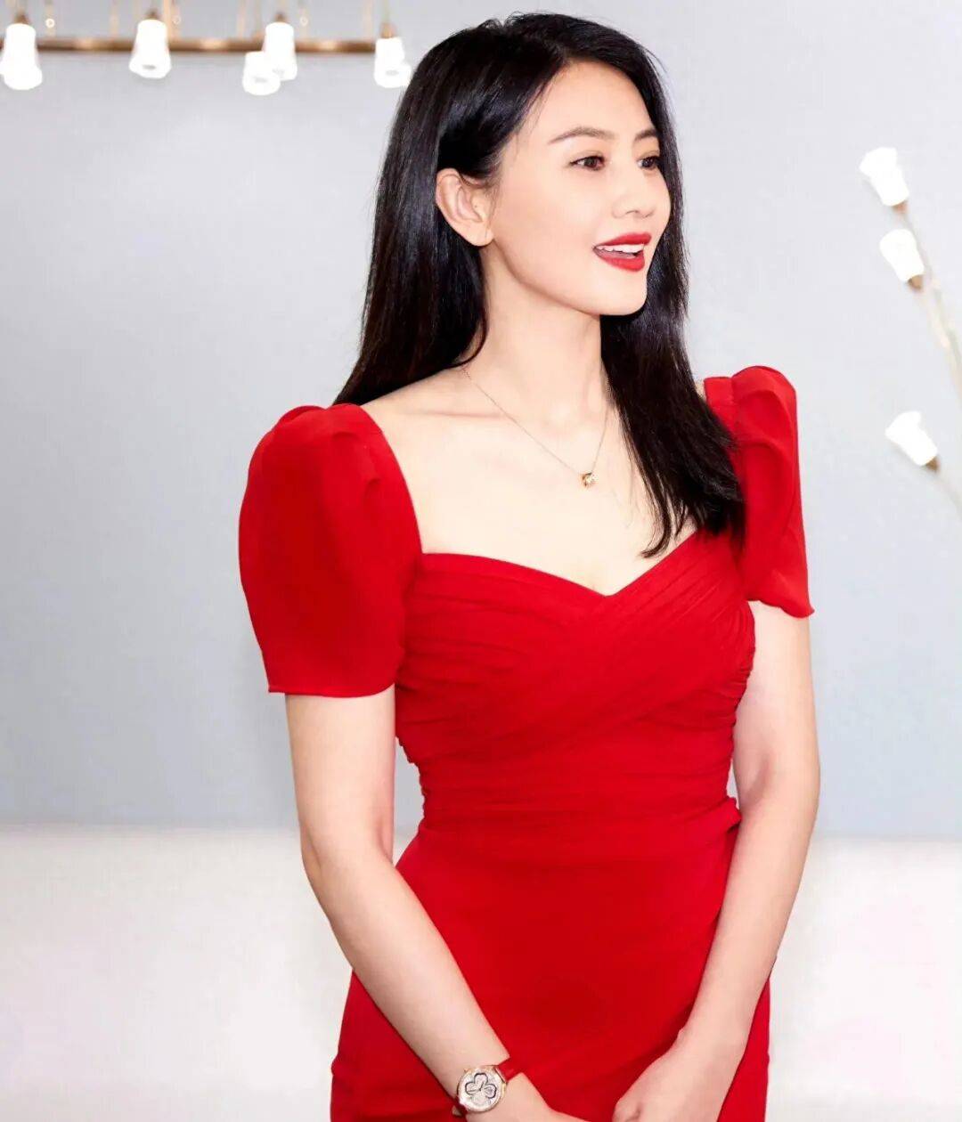 高圆圆身穿一袭红色抹胸衣裙,她俏脸清丽脱俗,浓眉大眼,烈焰红唇,乌黑的长发飘逸,露出白皙的香肩和手臂,侧身大秀曼妙身材,绝对性感撩人!