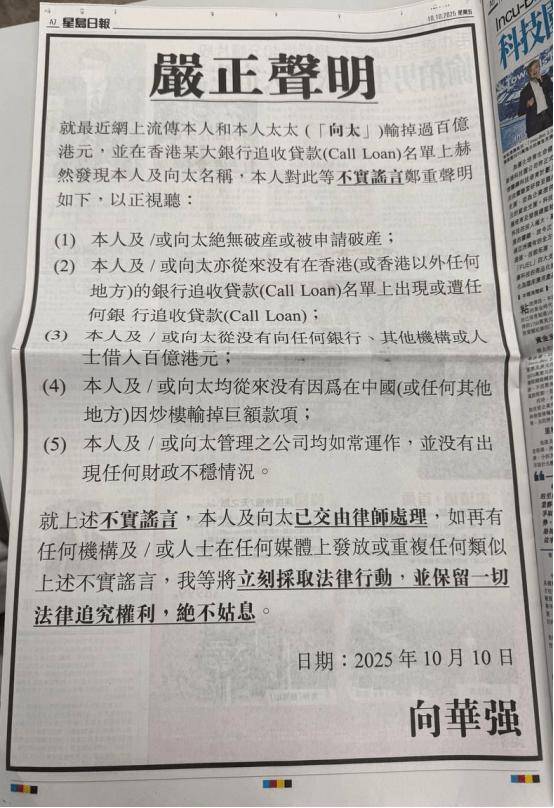 今日,向华强与夫人向太,突然公开发布一份声明,怒斥近日网络流传的向华强夫妇“输掉过百亿港元”、“被银行追债”等不实谣言,并表示他们已启动法律程序维护权益。