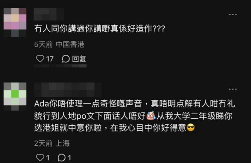 然而个别网友留言说:“没人跟你说过你说话真的很做作吗???”有网友看不下去:“Ada你不用理那些奇怪的声音,真不明白为什么有人这么没礼貌,跑到别人的帖子下面说坏话。我从大学二年级看你参加港姐竞选就喜欢你了,在我心里你特别可爱。”