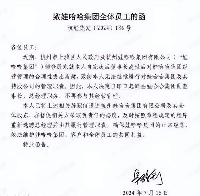 不过这次离职并不是第一次,早在24年7月份的时候,网上就曾曝出一封落款为宗馥莉的“员工函”,内容称其将辞去董事长的职位,没有几天后,娃哈哈在官方宣布消息,为了公司的健康稳定的发展,宗馥莉决定继续履行相关的管理职责。