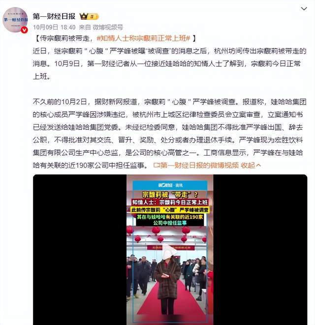 让人感到疑惑的是,11号下午,媒体还透露宗馥莉正常上班。如果这两则消息都是真实的,那么宗馥莉应该是正在走程序,现身集团的目的也无非是为了稳定外界的舆论,从时间线上也能看出来。