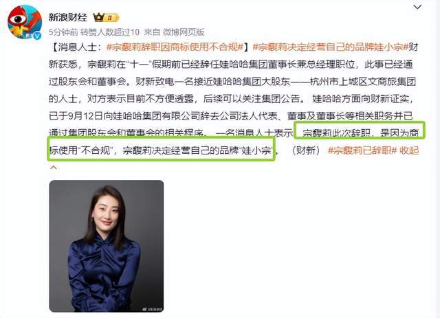 10月10号晚,据第一财经日报消息称,宗馥莉已经向娃哈哈集团有限公司辞去公司法人代表,董事以及董事长等相关职务,并且已经通过了集团股东会和董事会的相关程序,具体的请辞时间位于9月12号。