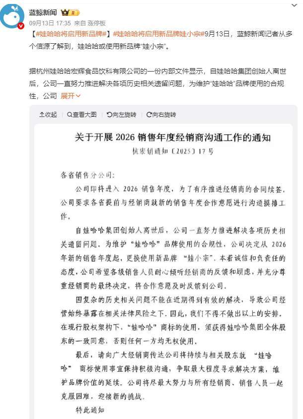 大约在9月中旬,网上传出一份关于娃哈哈的内部文件《关于开展 2026 销售年度经销商沟通工作的通知》,具体的内容则是为维护 “娃哈哈” 品牌使用的合规性,决定更换使用新品牌 “娃小宗”。