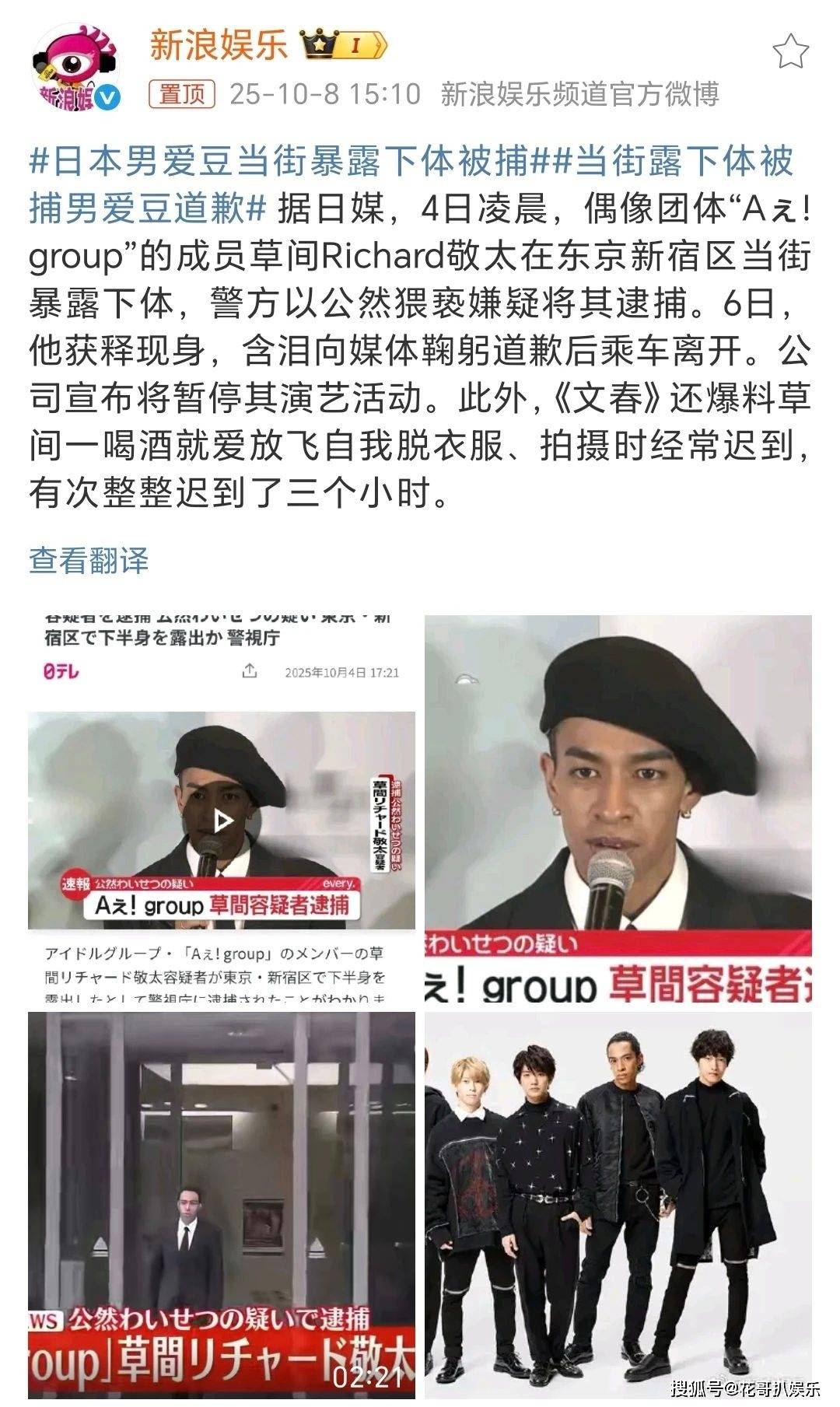 内娱最近热闹看多了,咱们看看外边的,果然,这世界上的明星都一样,房子只会五花八门地塌。这两天日媒报道,日本某男爱豆被警方逮捕,罪名是在公众场合当街暴露下体。日本著名八卦杂