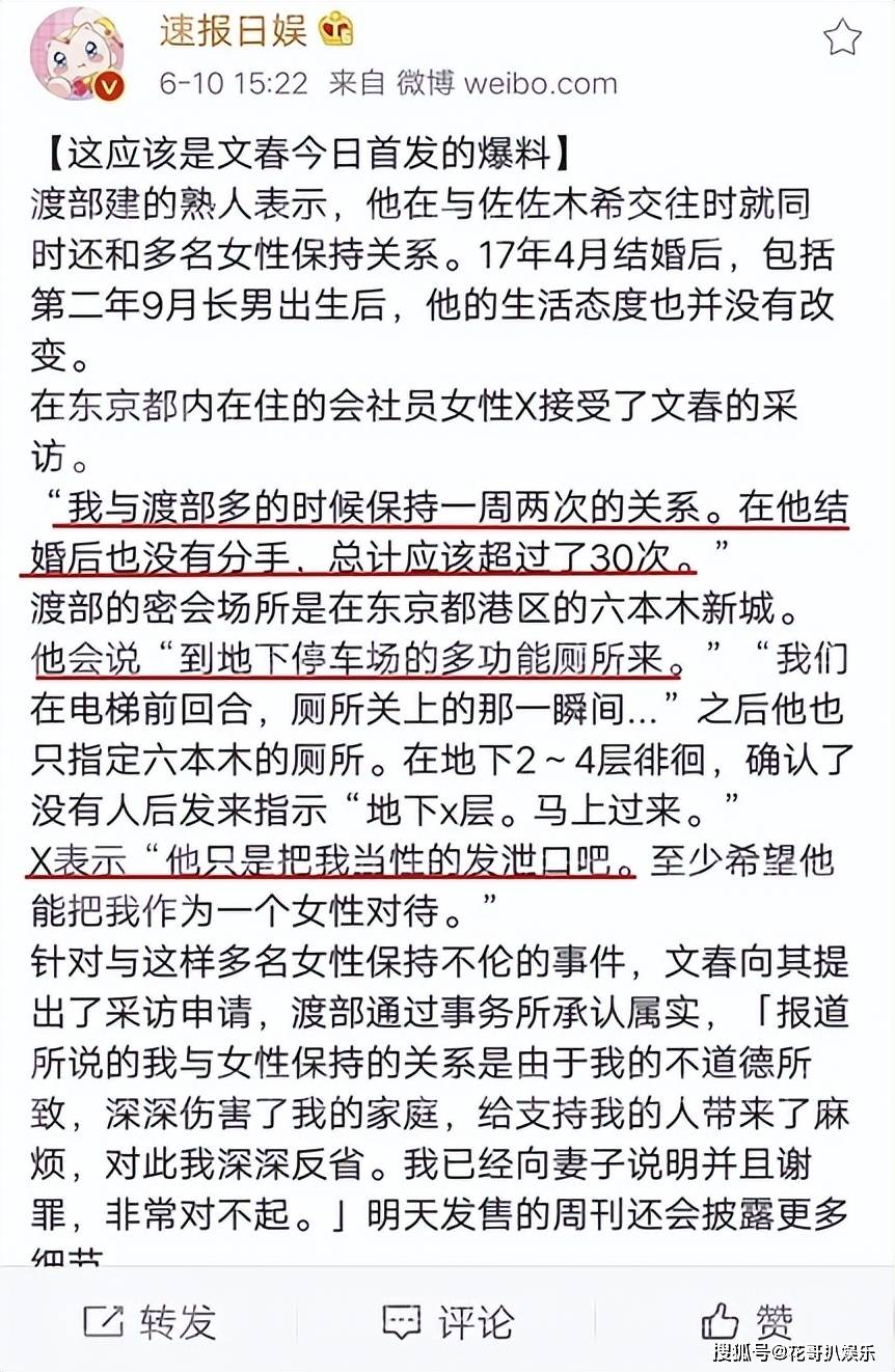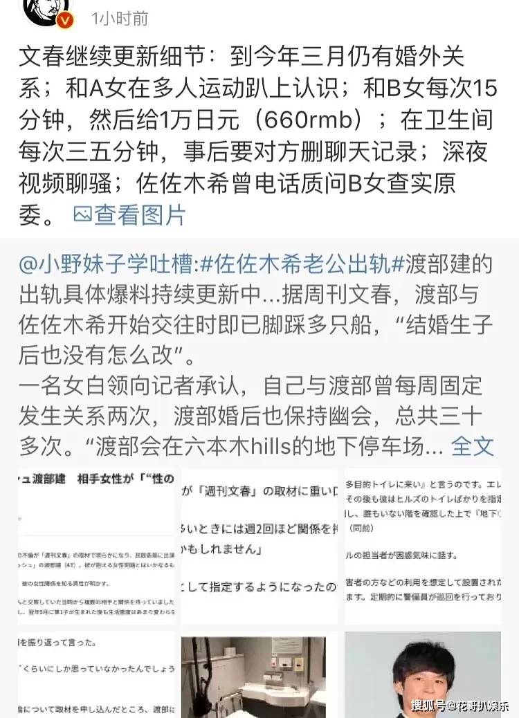 《文春》虽迟但到,曝光渡部建有多人运动的习惯,而且时间很短,人也很抠门,和约会对象搞完,甚至不给对方洗漱的时间,就把对方赶走了。佐佐木希外出工作的时候,他就打视频和约会对象搞。