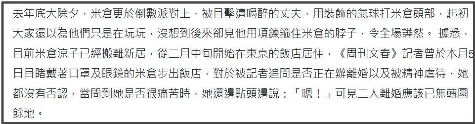 对米仓凉子动手的同时,前夫还住着女方的豪宅、花着女方的钱并出轨。