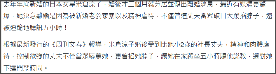 米仓凉子的前夫在公共场合就敢对她动手,私底下更是过分,让米仓凉子跪地五小时,还会掐她脖子。