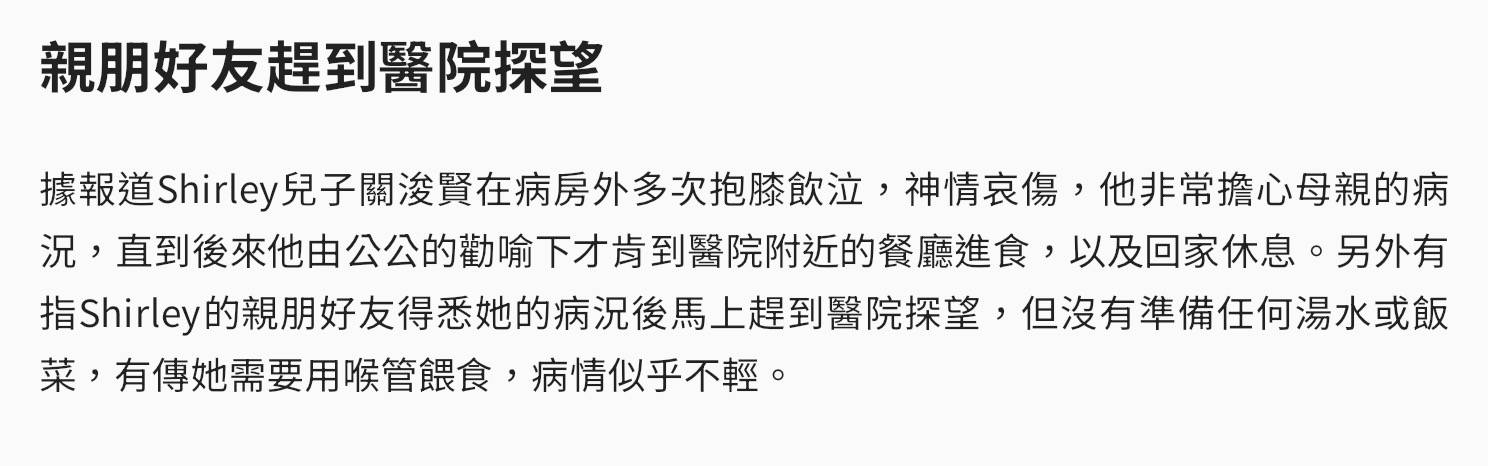 香港媒体报道称,关淑怡的儿子在病房外守候关淑怡,多次抱膝哭泣,可见他非常担心母亲的病情。已经在病房外守护关淑怡已经多日,其家人对他的健康状态也颇为担心,后来还是在关淑怡的父亲的劝说下,已经才到附近的餐厅用膳,以及回家休息。关淑怡患了什么重病不得而知,不过看起来应该很严重,关淑怡的好友在知悉其生病后也第一时间赶到医院探望,据称因为关淑怡已经不能正常进食,需要插鼻喉管进食。另外,在场的人士不只有他的儿子,他的父亲都在医院病房外守候,而关爸爸的神情一直很哀伤。