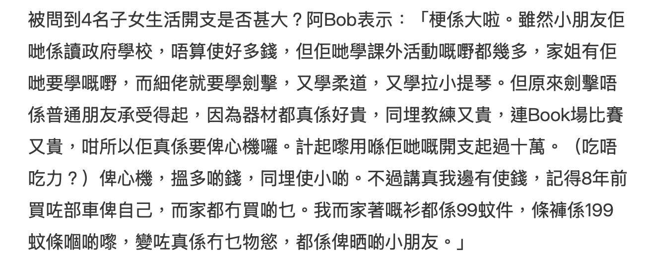 林盛斌在受访的时候坦言四个子女的生活开支很大,压力不小,他自曝孩子的月开销超过10万。林盛斌称四个孩子都还在念书,虽然读的都是政府学校,学费不贵,但是每个孩子的课外活动很多,兴趣班很多,其中儿子要学柔道,又要学拉小提琴,还有学击剑。而最贵的是击剑,器材贵,教练贵,一般的家庭还承担不起,所以赚钱的压力就比较大。