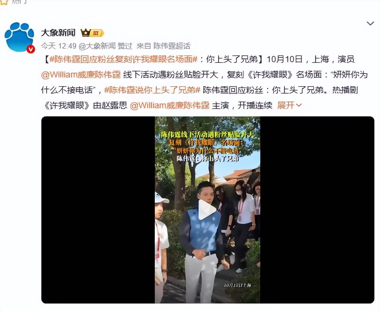 10月10日,陈伟霆在上海参加线下活动现场遭遇戏剧性一幕。当他参与活动时,现场突然有男粉丝高声喊出热播剧《许我耀眼》中的经典台词:“妍妍,你为什么不接电话!”这句