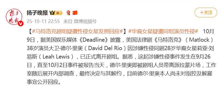 一桩发生在派拉蒙片场拖车内的涉嫌性侵事件,正撕裂着美国律政剧《马特洛克》的台前幕后。38岁男演员大卫·德尔·里奥被曝对同剧组28岁华裔女星莉亚·刘易斯实施性侵,从事件发生到剧组火速切割,仅用了16天。